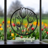 Prezentowana dekoracja to ażurowa zawieszka w kształcie koła o średnicy 30 cm, wykonana z jednostronnej płyty HDF. Wewnątrz okręgu znajduje się precyzyjnie wycięty motyw trzech tulipanów, które nadają całości lekkości i elegancji. Dekoracja jest utrzymana w minimalistycznej, czarnej kolorystyce, dzięki czemu doskonale komponuje się z różnymi aranżacjami wnętrz.
