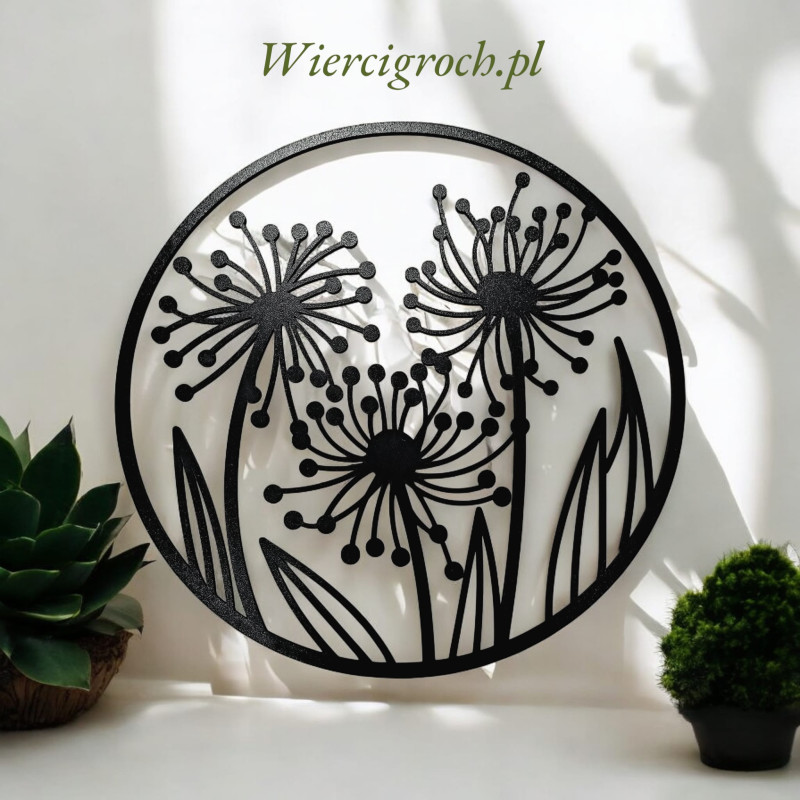 Nowoczesna dekoracja ścienna przedstawiająca ażurowy motyw trzech dmuchawców w okręgu. Wykonana z jednostronnej płyty HDF, ma średnicę 30 cm. Czarna, matowa powierzchnia nadaje jej elegancki i uniwersalny charakter, dzięki czemu idealnie wpasuje się zarówno w nowoczesne, jak i klasyczne wnętrza. Lekka konstrukcja umożliwia łatwy montaż na ścianie, oknie lub drzwiach.